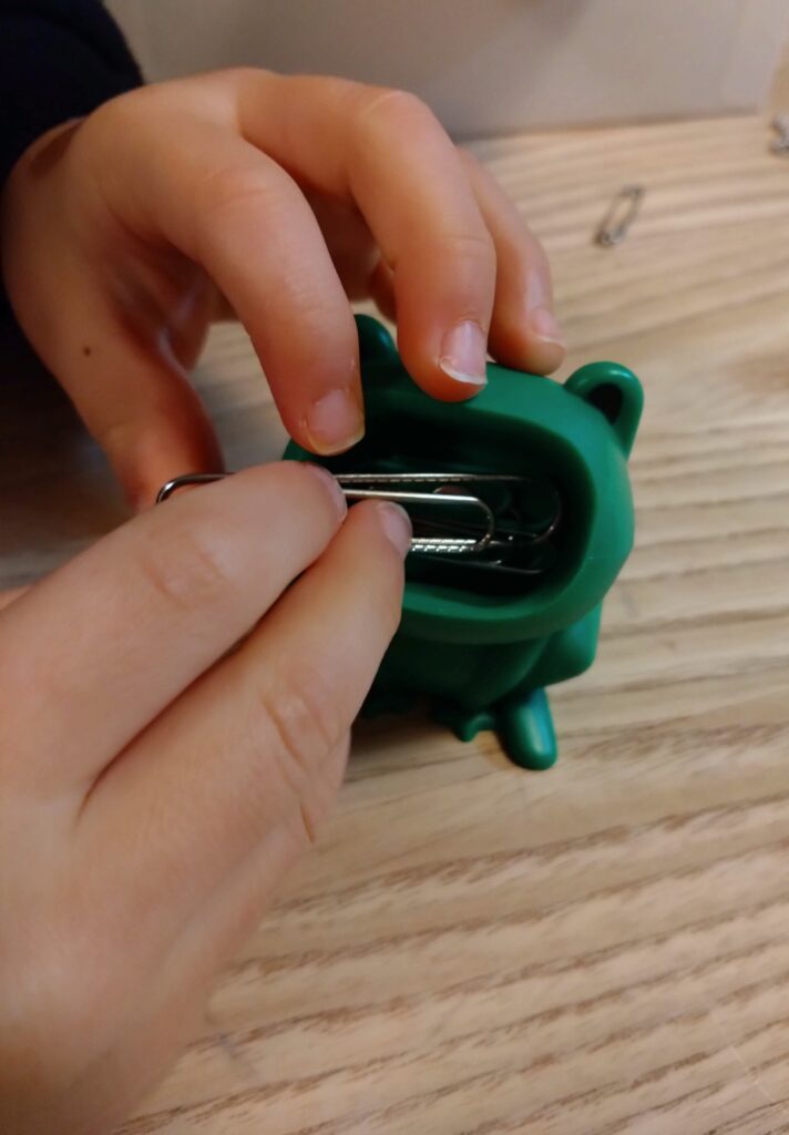 ↑この画像のカエルの口に収まっていたクリップ数は10個前後でした。
