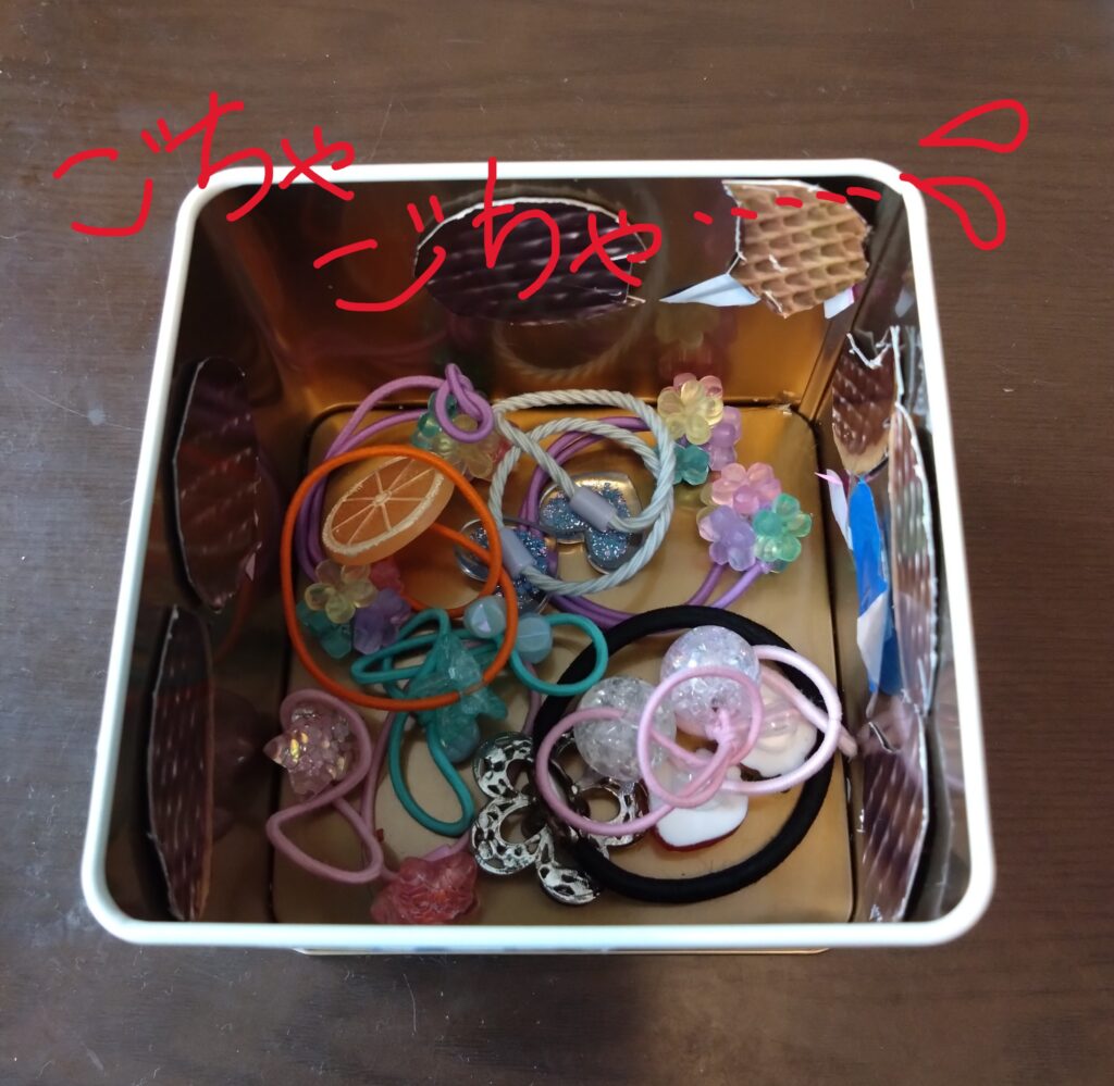まず、我が家では今までヘアゴム類は、使い終わったお菓子の缶などにぽいぽいと適当に入れていました。ですが、ヘアゴムの種類が増えてくるとごちゃごちゃして、お目当てのヘアゴムどこいった!?状態に・・(ノ_·,)