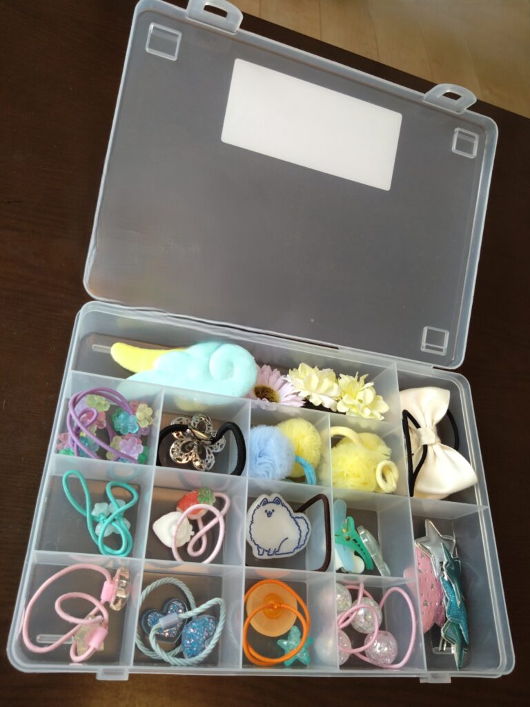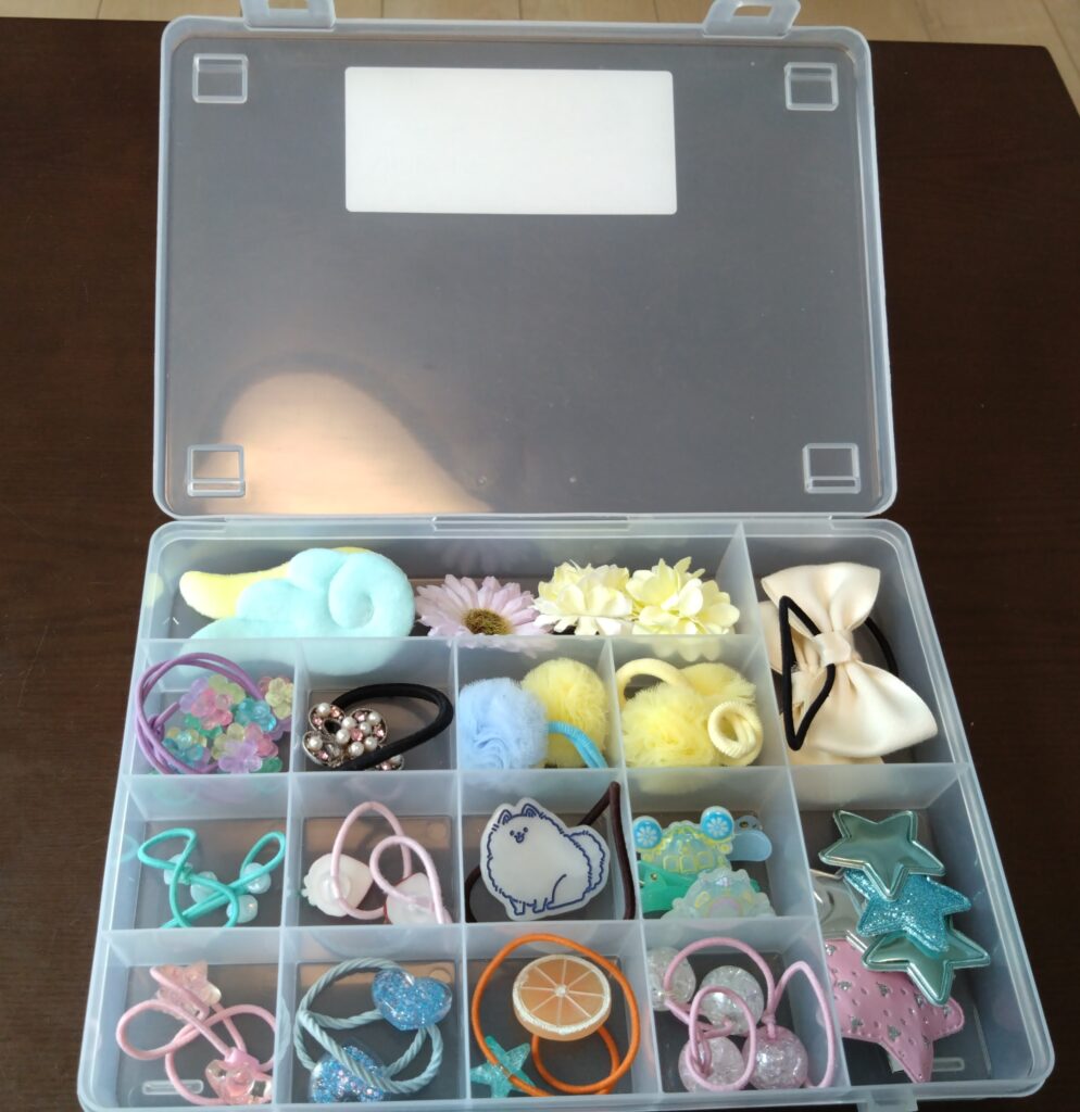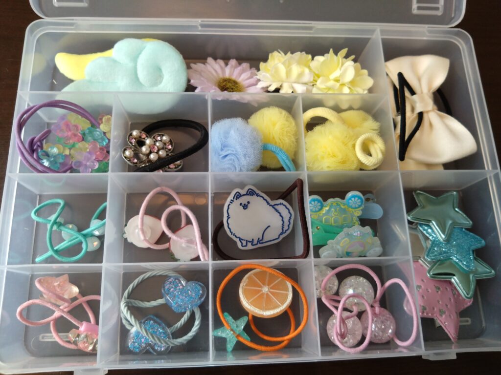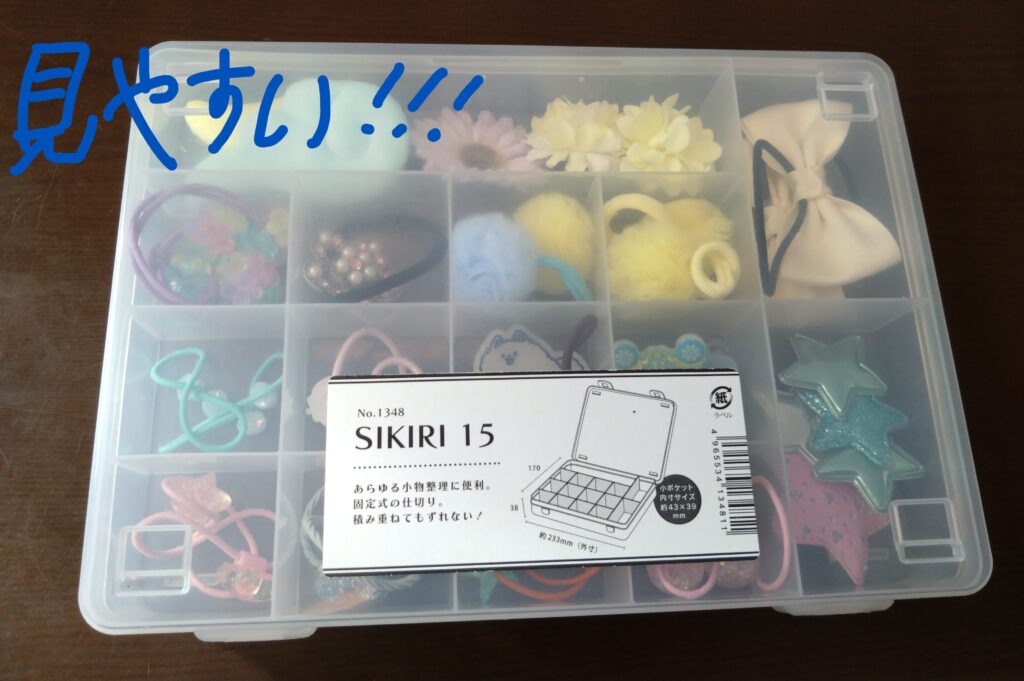 SIKIRI15には小さい区画と大きい区画が存在するため、小さい区画には飾りゴムを、大きい区画には大きめのぱっちんピンなどを分けて入れました。