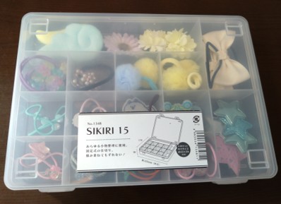 SIKIRI15には小さい区画と大きい区画が存在するため、小さい区画には飾りゴムを、大きい区画には大きめのぱっちんピンなどを分けて入れました。