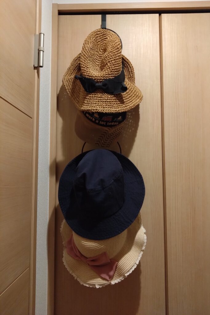 ちなみに我が家では、玄関から入ってすぐのクローゼットの扉に設置しました。ここに設置したことで、お出かけ前に自分のお目当ての帽子がどこにあるか一目でわかって、さっと取りやすいです♪(以前重ねて置いていたときは、自分の帽子がどこにあるかいちいち探さないといけなかったから、時間の無駄でした・・)